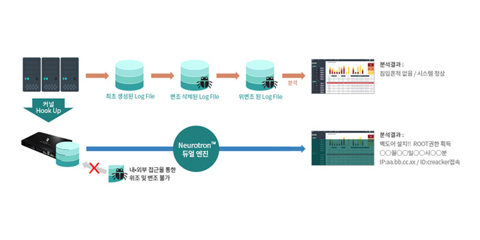 각 호스트 시스템 변조 불가 로그 저장 및 인공지능 엔진을 통한 비정상 행위 감시
