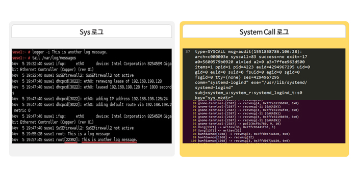 - · 시스템 콜(System call)의 경우 악성코드가 메모리에서 동작하거나 로그를 지우려 하여도 모든 동작이 나타남